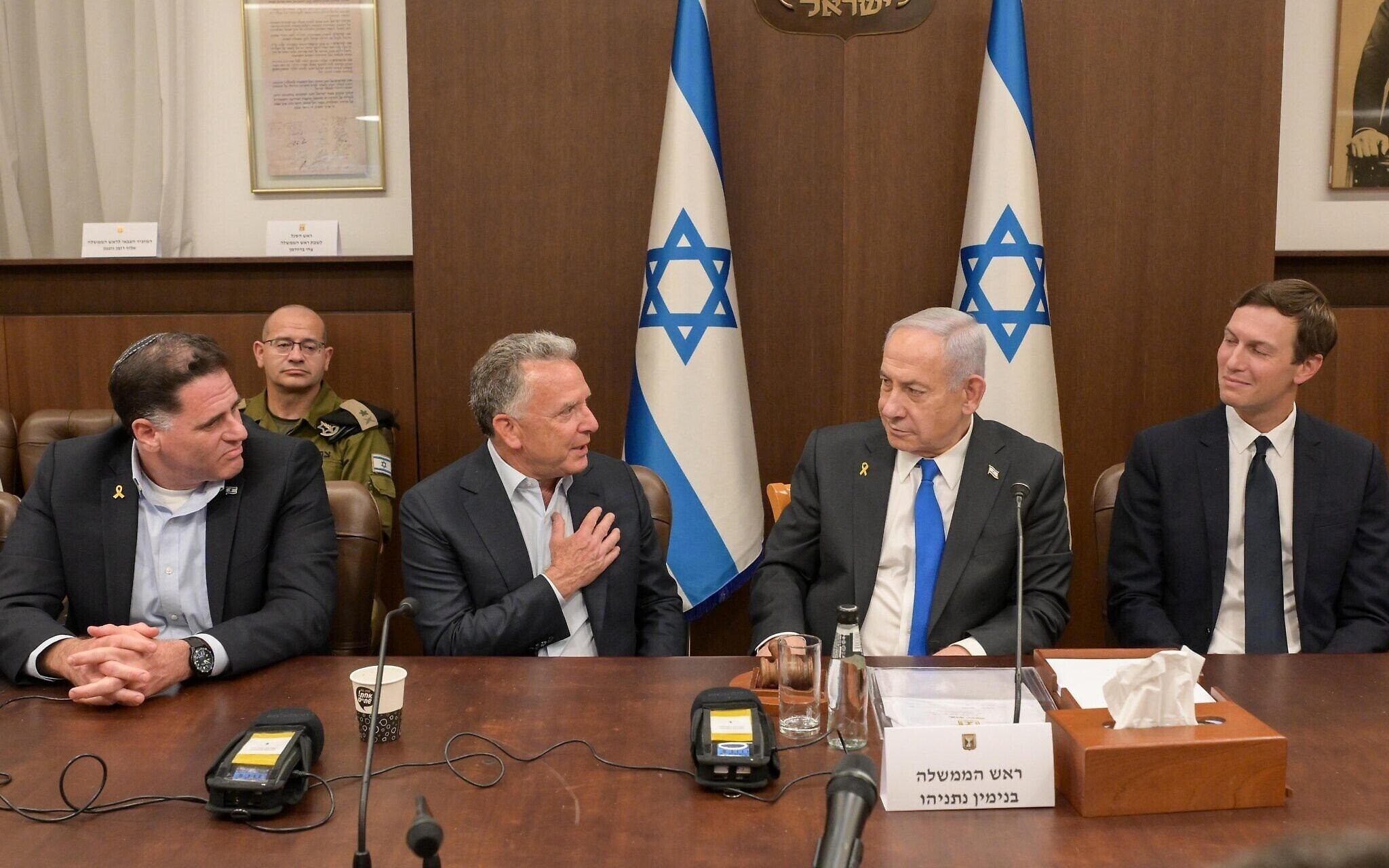 რონ დერმერი, სტივ უიტკოფი, ბენიამინ ნეთანიაჰუ და ჯარედ კუშნერი ისრაელის მთავრობის სხდომაზე, 9 ოქტომბერი, 2025 წელი
