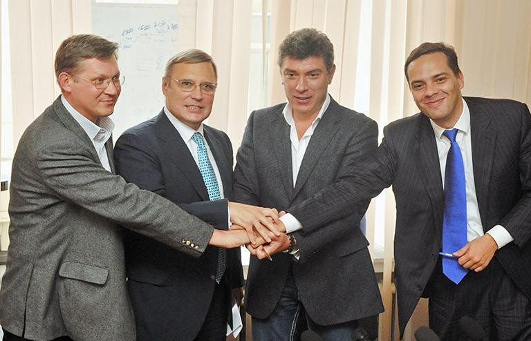 ვლადიმირ რიჟკოვი, მიხაილ კასიანოვი, ბორის ნემცოვი და ვლადიმირ მილოვი (მარჯვნივ), დემოკრატიული კოალიციის "რუსეთისთვის თვითნებობისა და კორუფციის გარეშე" შექმნის დღე, 16 სექტემბერი, 2010 წელი
